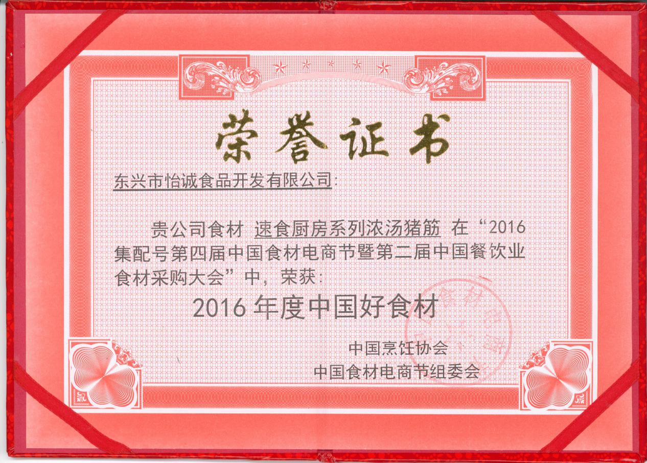 經(jīng)過長達(dá)30天激烈的海選,線上平臺總投票數(shù)超過24萬票,“濃湯白汁燉豬筋”菜肴在82家參選商中脫穎而出,最終獲得“2016年度第四屆電商食材節(jié)中國好食材獎”。并且創(chuàng)制本菜式的公司星級廚師團(tuán)隊(duì)亦以其精湛廚藝獲得大會頒發(fā)“中國好菜式”獎項(xiàng)。