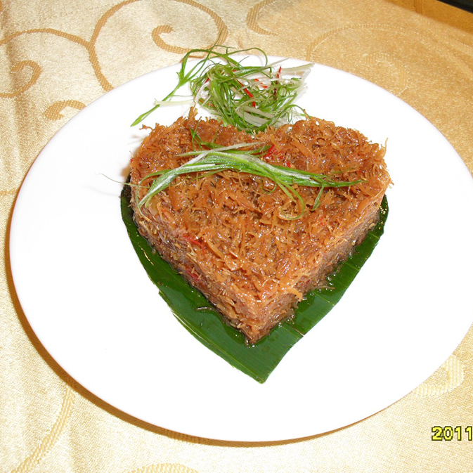 配料:怡誠(chéng)牌瑤柱絲香辣罐頭、蛋清、栗子、松子仁、紫米、蔥花