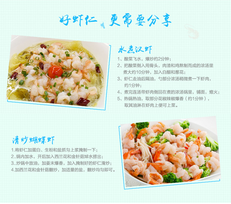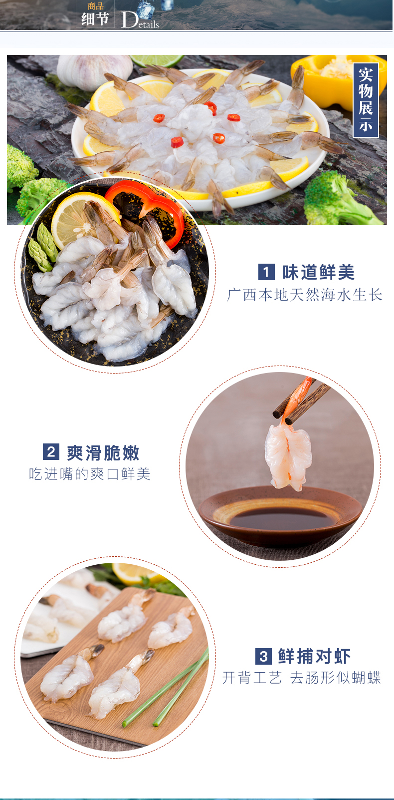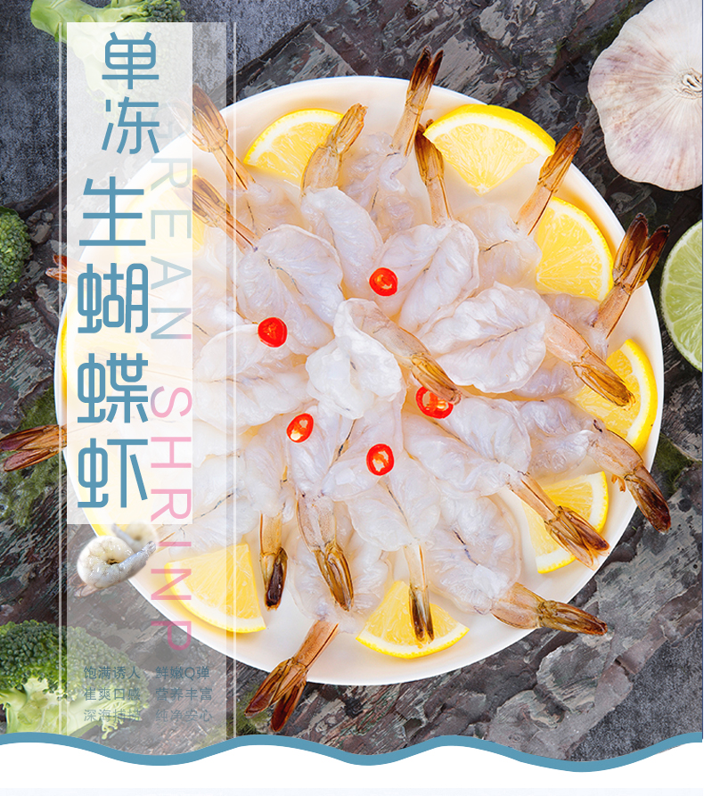 本產(chǎn)品選用北部灣海域捕撈的鮮活白對蝦為原料,運(yùn)用專業(yè)冷鏈物流運(yùn)輸設(shè)備,把白對蝦迅速地運(yùn)送到潔凈的生產(chǎn)車間內(nèi),專業(yè)處理去頭去殼,去除蝦線保留蝦尾,再沿蝦體中部將蝦肉剖開,切割過程中不損害蝦體天然肉質(zhì)纖維,最終使蝦肉整體呈蝴蝶狀。在高端流水生產(chǎn)線進(jìn)行生產(chǎn)加工下,蝴蝶蝦肉能在新鮮狀態(tài)下成為速凍產(chǎn)品,最大限度地保存了蝴蝶蝦肉的鮮美品質(zhì)。產(chǎn)品包裝美觀實用,分量充足,食用方便,蝦肉外形精致,口味鮮甜清新,可用于烹制黃金蝴蝶蝦、翡翠蝴蝶蝦等日常家庭菜肴或各式餐飲場合。