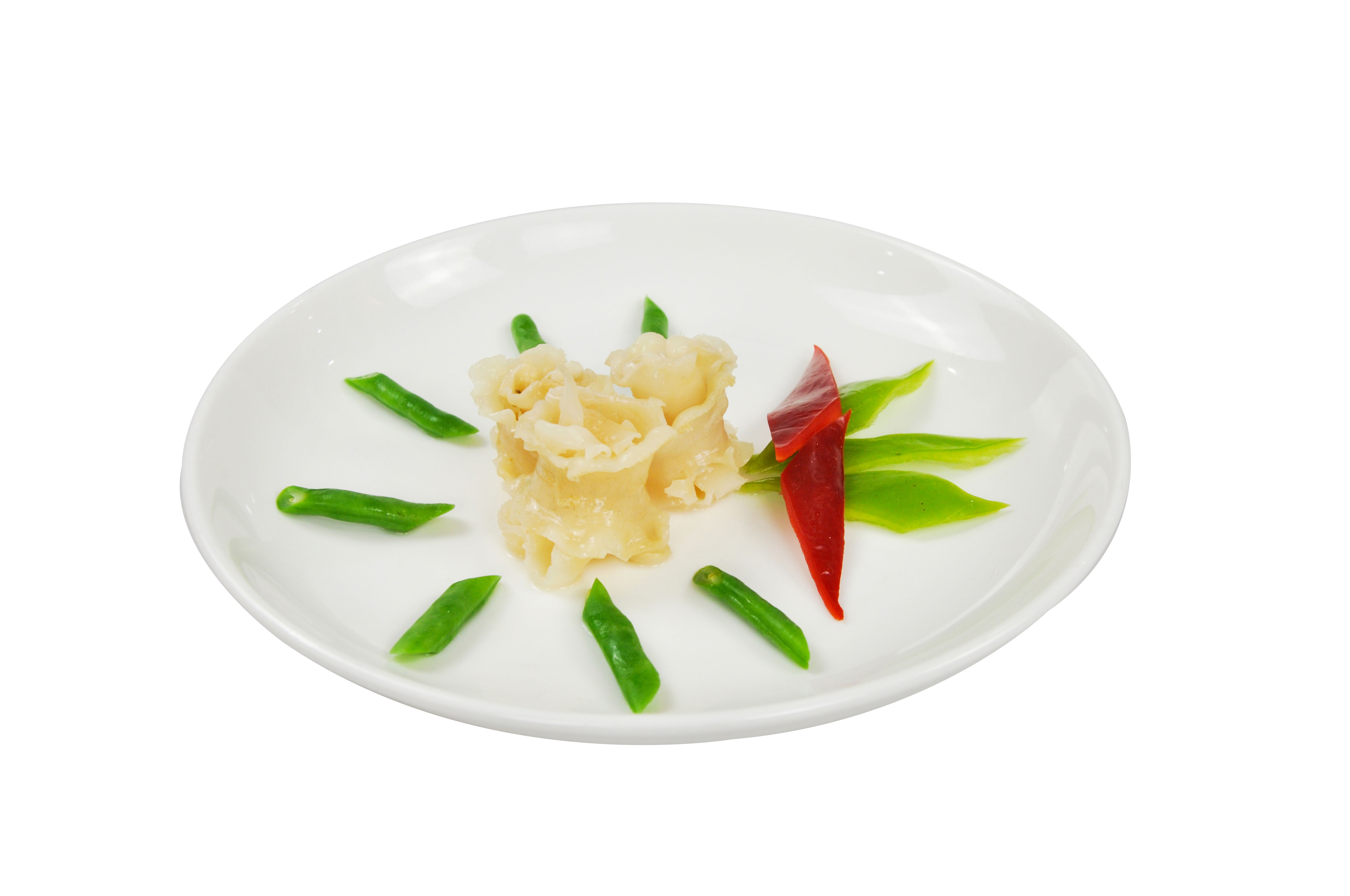 鱈魚生長于大陸架深海海域,是世界捕撈量最大的食用魚類之一,鱈魚肉豐滿多脂,味道甘美香潤,蛋白質(zhì)含量豐富,肝臟所含營養(yǎng)比例特別適合人體吸收,享有餐桌上的營養(yǎng)師之美譽(yù)。本產(chǎn)品選用深海捕撈的藍(lán)鱈魚為原料,運(yùn)用專業(yè)冷鏈物流運(yùn)輸設(shè)備,將藍(lán)鱈魚運(yùn)送到潔凈無菌的生產(chǎn)車間內(nèi),由專人完整地切出魚肚膠,細(xì)心去除附著雜質(zhì)并避免魚肚膠表面受損,全面清洗后浸泡純凈冰水以改善質(zhì)感,再經(jīng)專用的流水生產(chǎn)線和平板速凍設(shè)備冷凍加工,使魚肚膠在短時間內(nèi)急速冷卻,充分地保留特有的鮮軟口感和內(nèi)在營養(yǎng)成分。加工后的魚肚產(chǎn)品白嫩軟滑,膠糯綿韌,嬌纏香潤,松彈緊致,解凍后烹調(diào)各式菜肴皆為桌上珍品。
