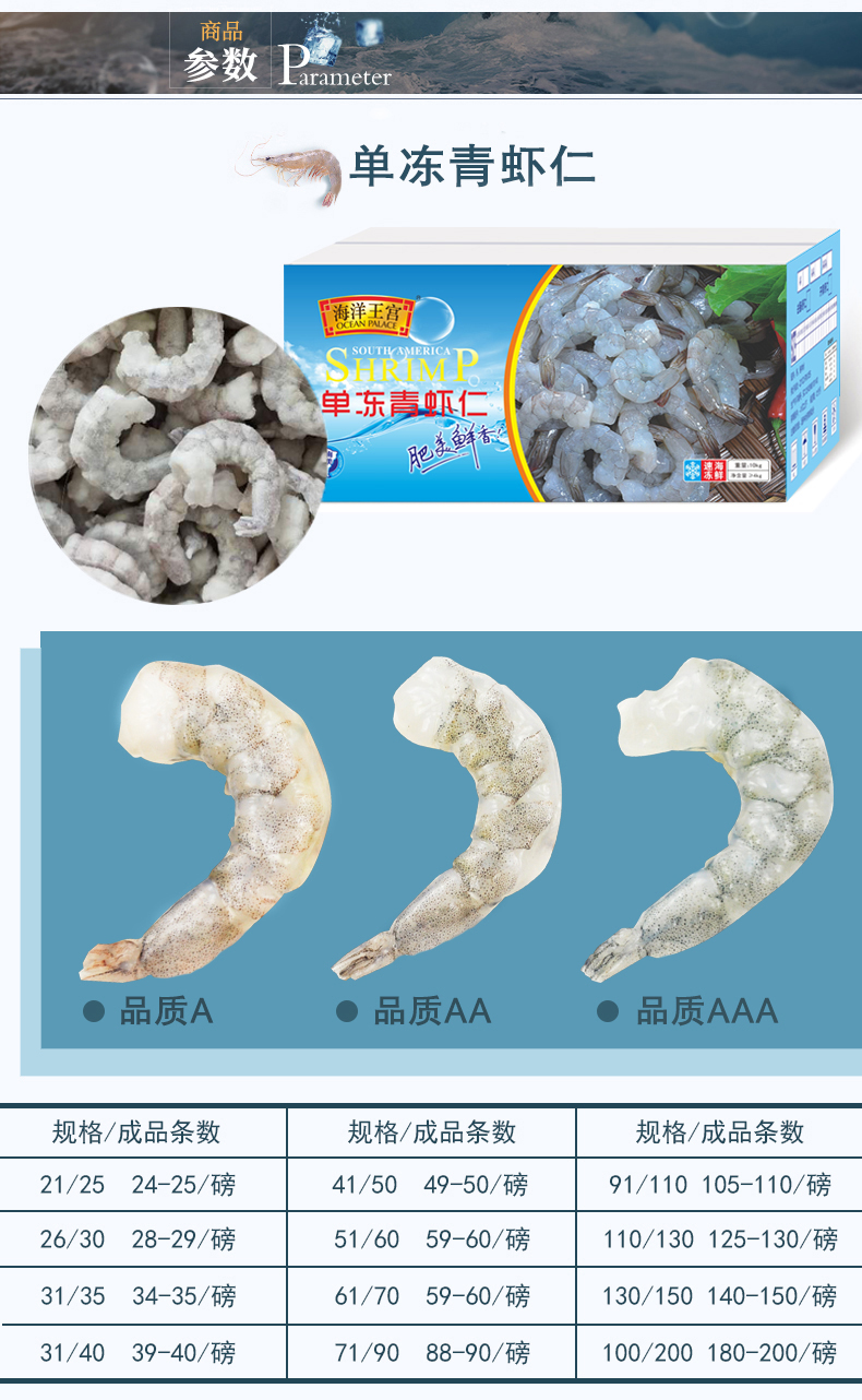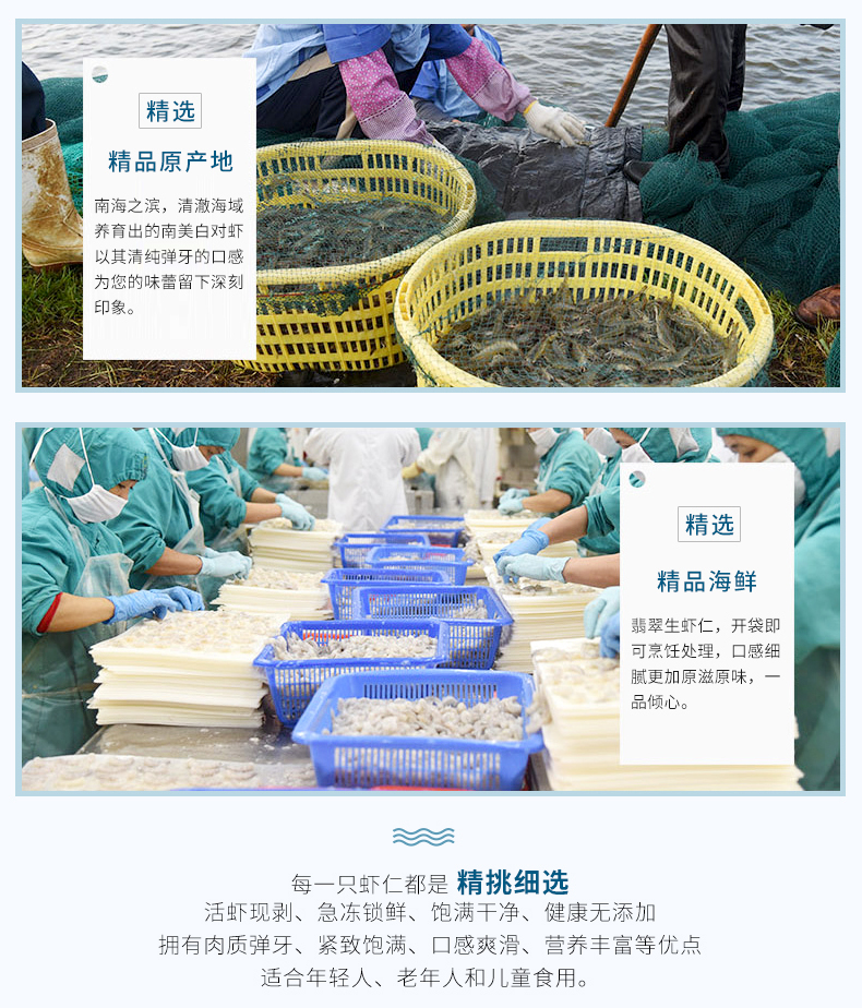 南美白對(duì)蝦原產(chǎn)于南美洲太平洋沿岸海域,大多數(shù)棲息于泥質(zhì)海底,生長(zhǎng)發(fā)育條件優(yōu)異,體內(nèi)營(yíng)養(yǎng)豐富。南美白對(duì)蝦外表呈青灰色,蝦殼薄而蝦肉飽滿,肉質(zhì)鮮美并且含肉率高,因而深受人們喜愛(ài),是餐桌上常見(jiàn)的海鮮菜肴。本產(chǎn)品選用北部灣海域捕撈的鮮活白對(duì)蝦為原料,運(yùn)用專業(yè)冷鏈物流運(yùn)輸設(shè)備,把白對(duì)蝦迅速地運(yùn)送到潔凈的生產(chǎn)車(chē)間內(nèi),專業(yè)處理去頭去殼,并以完善的冷凍保鮮技術(shù)和嶄新的高端流水生產(chǎn)線進(jìn)行生產(chǎn)加工,使白對(duì)蝦仁能在新鮮狀態(tài)下加工成為速凍產(chǎn)品,最大限度地保存了鮮活白對(duì)蝦的鮮美品質(zhì)。